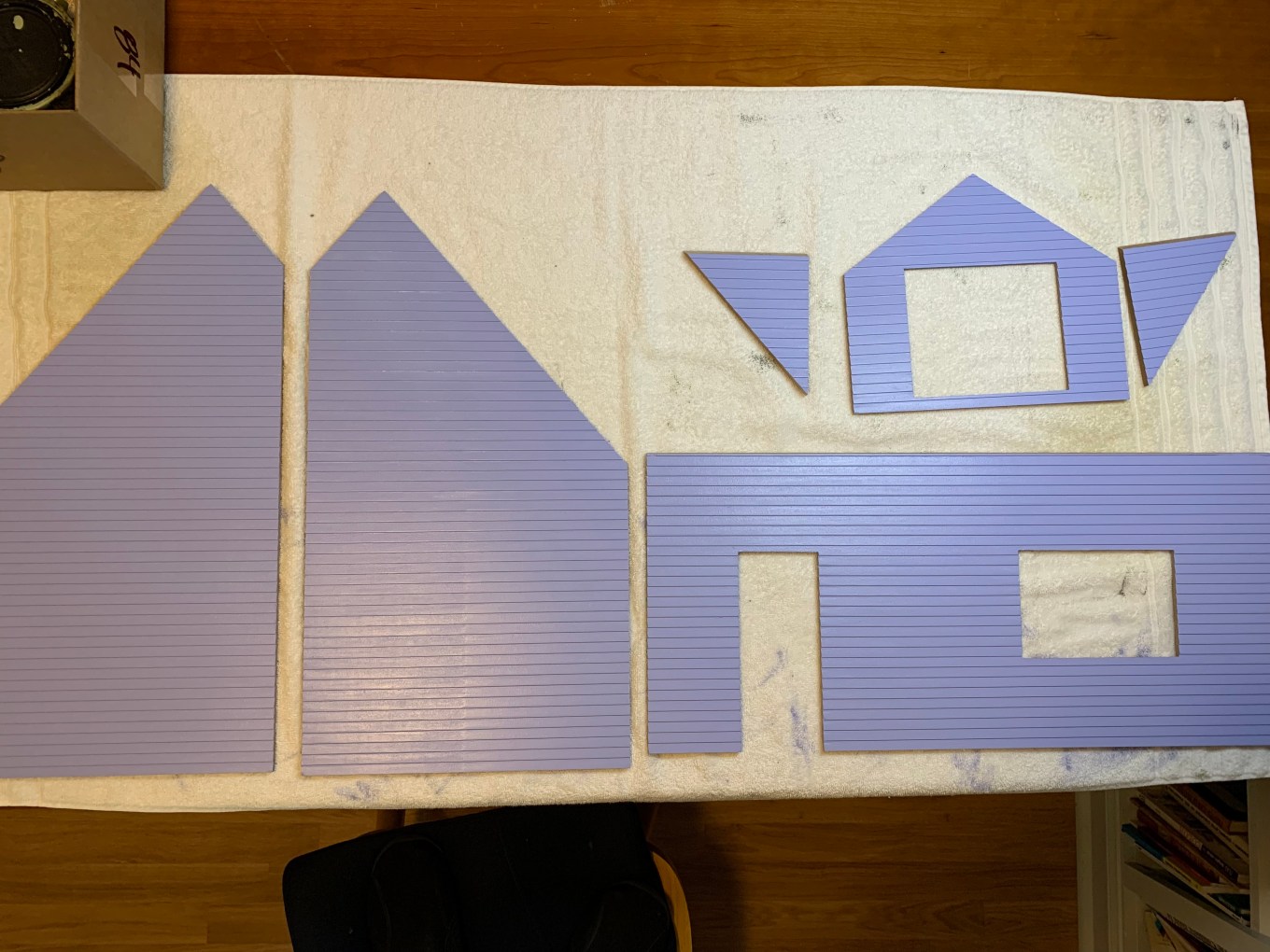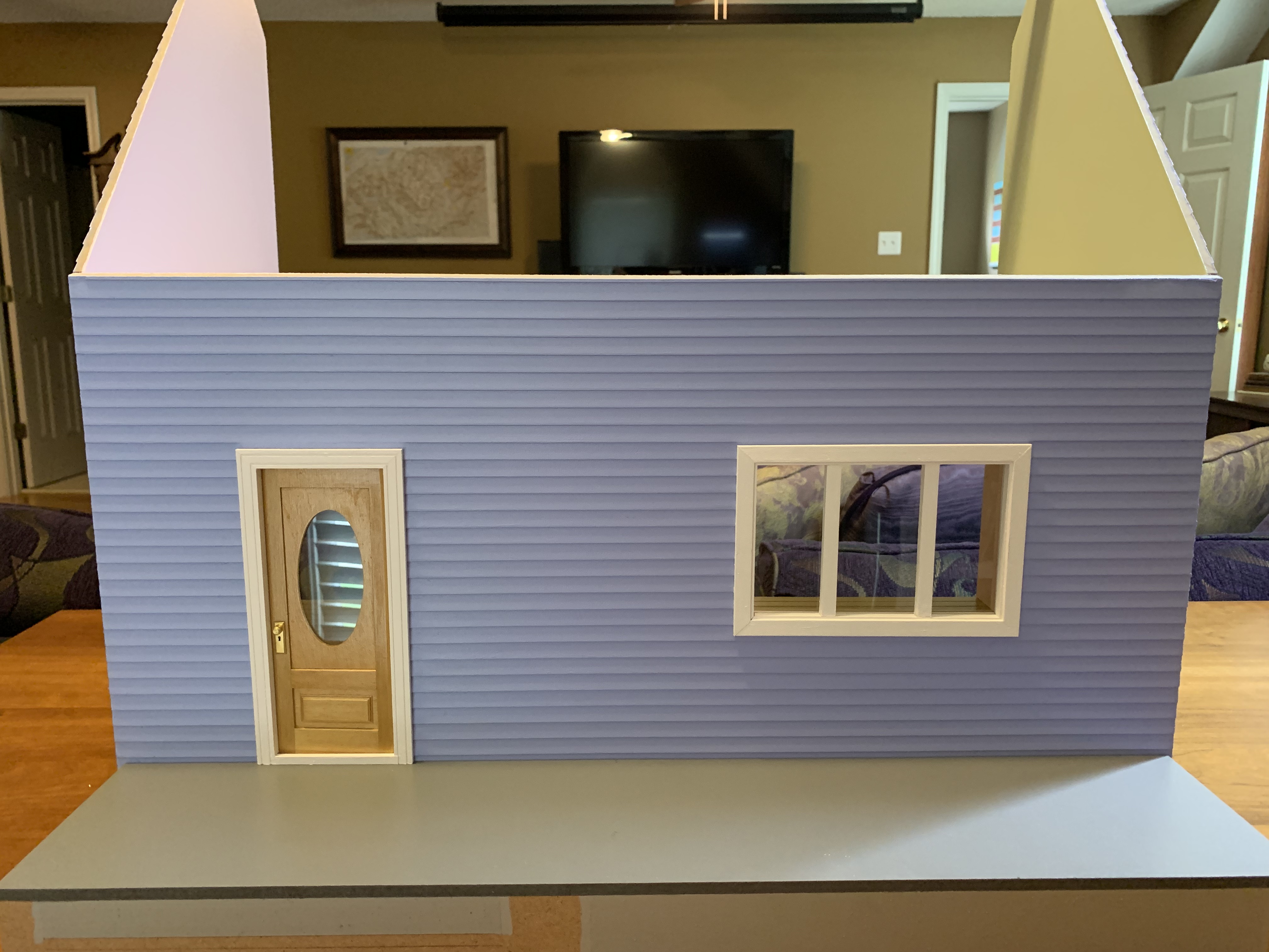 I have written several times before how painting and sanding the exterior clapboards between coats of paint is one of the most tedious, tiring, and labor-intensive steps. With the four different doll houses that I have built in the last few years, each time I have tried a different technique to try to simplify and improve this process, but with little success. For this doll house, I returned to one of those techniques whereby I painted a first coat, sanded it with a 220-grit sanding block, painted a second coat, sanded it with a 400-grit sanding block, and then painted two more coats to achieve a fairly smooth finish. Once I had painted that last coat, I was relieved that this step was once again finished.