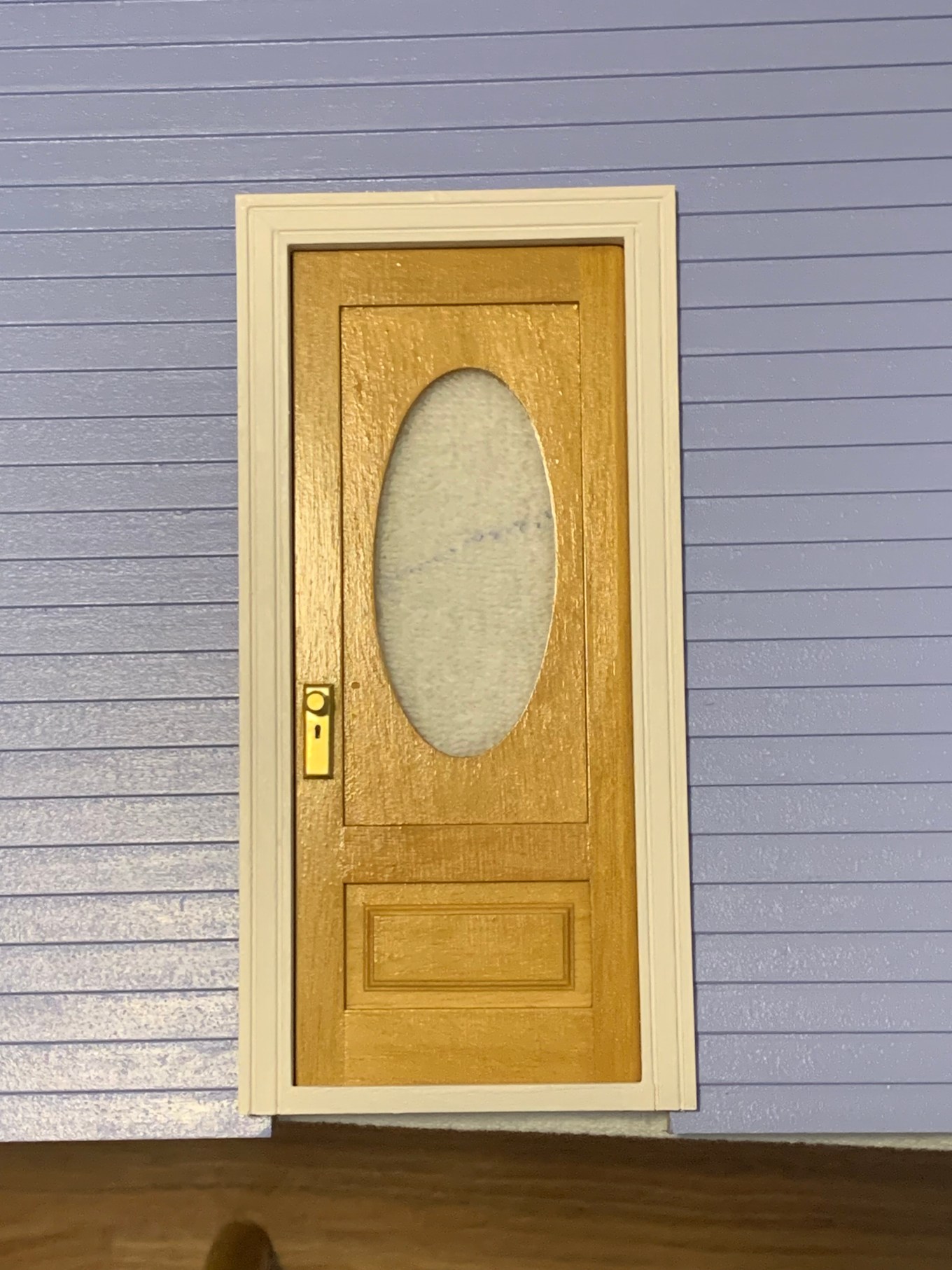 The last item I wanted to finish before assembling the house was the front door. This kit came with a very nice door with large oval light. Staining it a light pine color and brushing on three coats of polyurethane (with sanding in between) gave the door an inviting look.