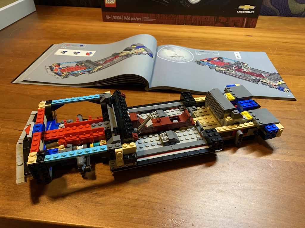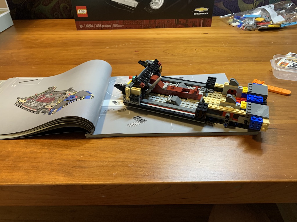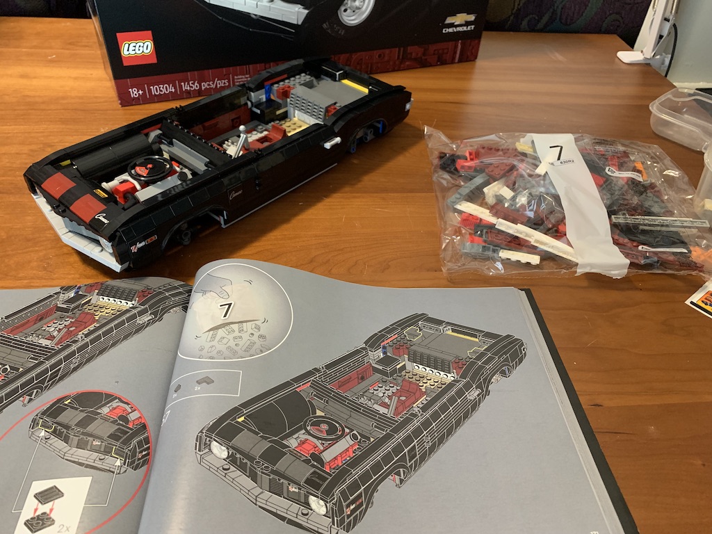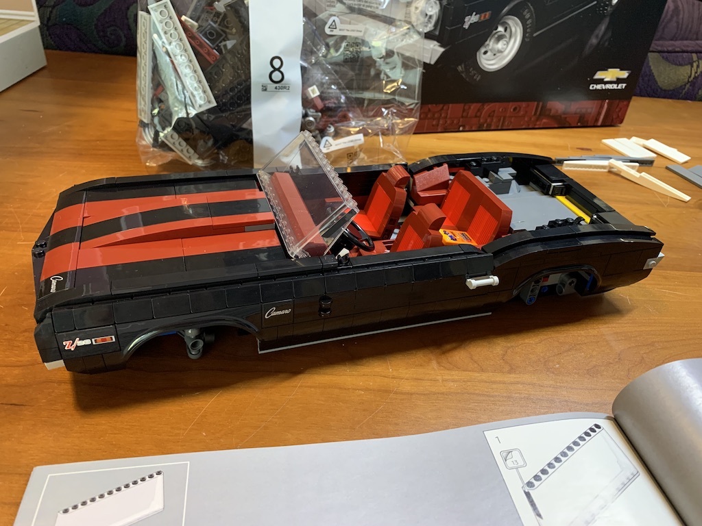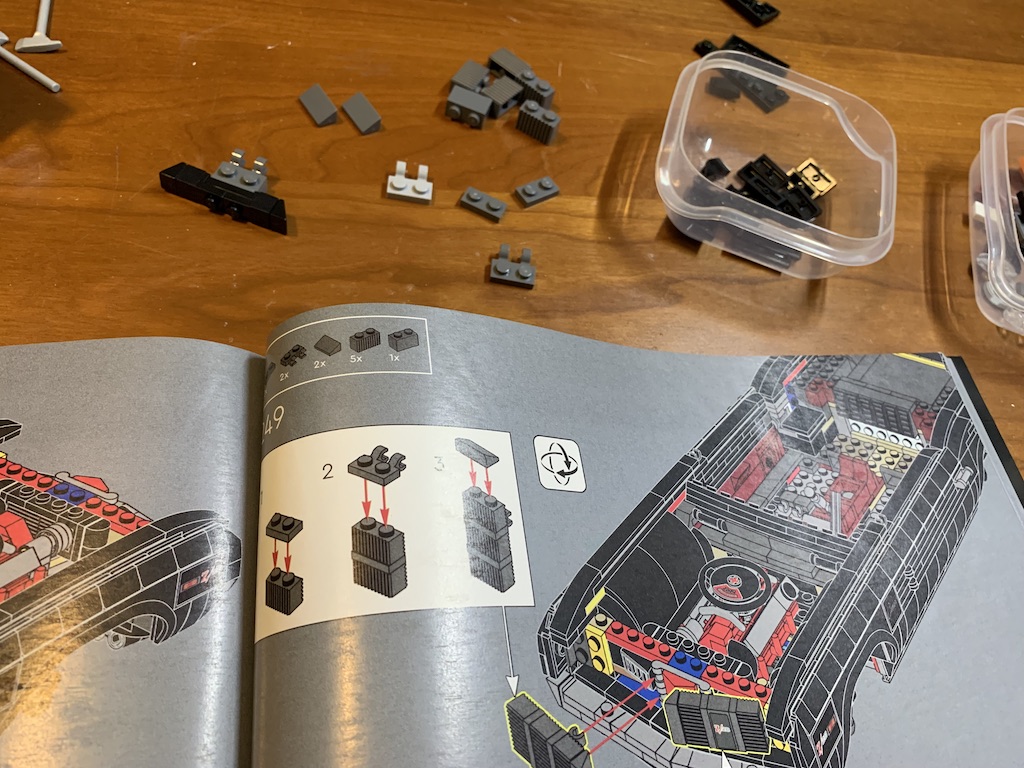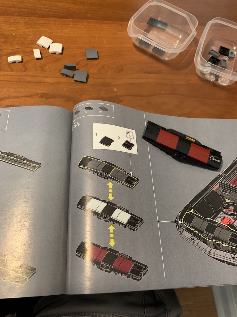 A couple of weeks went by before I could return to my Camaro and start with bag #6. This bag laid the foundation for later steps and was going fine until towards the end of the bag when I needed four black angled pieces but what I had left was two black and two dark grey ones. Sometimes in the instructions, the two colors are hard to discern being different.