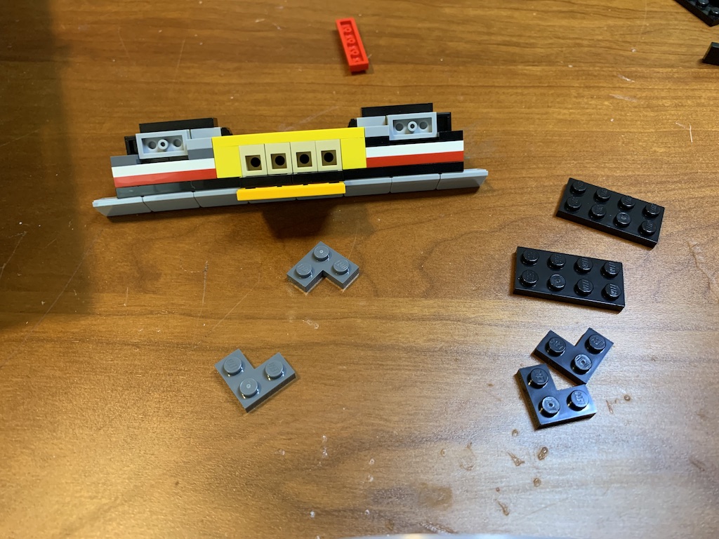 Looking back, I discovered that when building the taillight assemblies, I had accidentally used black angle pieces on one side when I should have used dark grey (you have to look closely on the right taillight assembly to see the black peeking out between the yellow and light grey pieces whereas on the left, dark grey is peeking out). Fortunately, this was an easy fix.