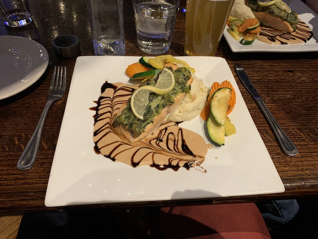 … and on the second night, we met in New Brunswick. This is where I used to regularly teach in person and we ate at the brewpub I always went to during my stay, this time again getting to savor their latest delicious salmon entre.