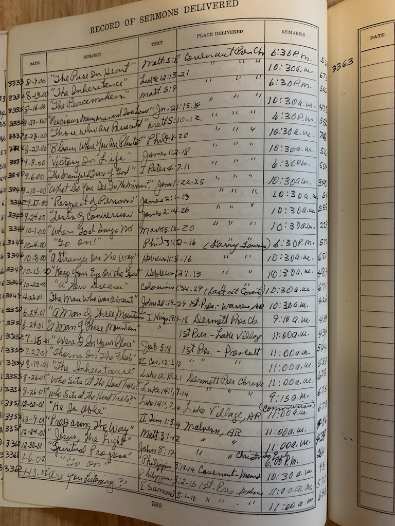 As you can see, included in that book is a section entitled: “RECORD OF SERMONS DELIVERED.”  I had previously determined in reading through that section that over his lifetime, my dad had preached 3,362 sermons.  But when I opened to that page again, I saw that the date for sermon #3,362 was 1-13-02, not 2-3-2002 as indicated on the manila folder.