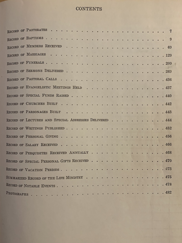 Unless you are a minister, you have probably never heard of this type of bound book which includes sections for recording a variety of activities and events that would occur throughout a paster’s life.  My dad had carefully filled out many of these sections throughout his career and continued even after he retired.  At the time I received it, I recognized it as a roadmap to my dad’s entire ministerial career, carefully scripted in his own handwriting (maybe today these are electronic records).