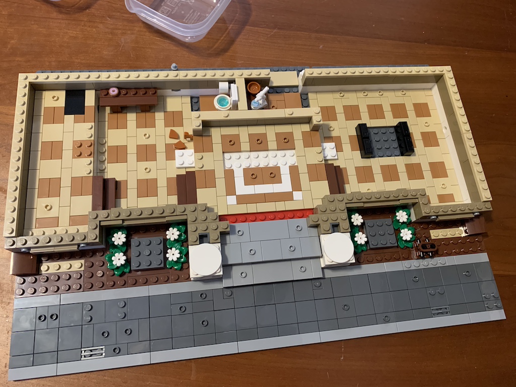 I continued adding pieces from bags 3 and 4 which mostly created the ornate first floor, but once I finished bag 5, I felt like I had something interesting to show for my efforts. At the back of the museum was a toilet complete with a roll of toilet paper. And backing up to that was a microscope on a desk. Oh, and if you notice the pink circle on the brown bench, according to the storyline in the instruction manual, someone had been to the police station’s donut shop (another building module from a prior year) and left a sticky donut on the bench. How inconsiderate!