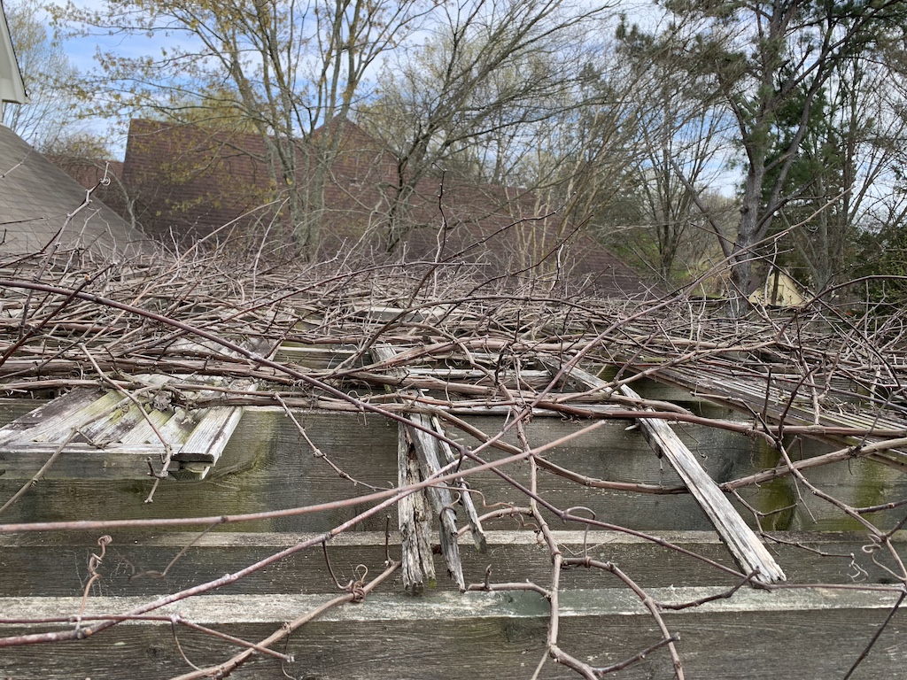 At some point, my wife planted a vine that she trained to grow up one of the pergola posts.  Over the years, the canopy of the vine spread across the top of the pergola providing even more shade in the summertime.  The growth continued unabated to the point at which it became an annual activity for me to trim the vine branches that had grown out beyond the support of the pergola arching their way back towards the ground.  This also led to an even bigger problem.