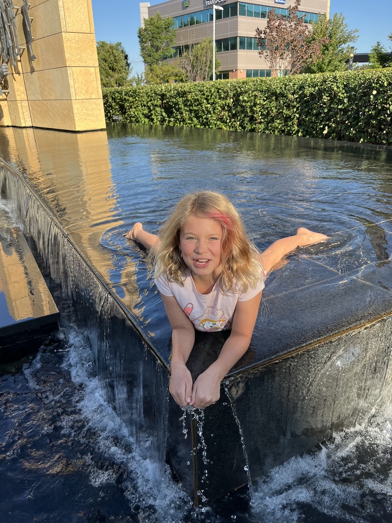 Now already wet, she decided to take full advantage of the cool water fountain.