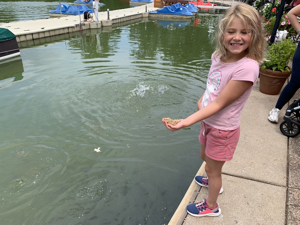 Sitting at a table next to the lake, the restaurant provided free fish food to feed the fish which our granddaughter thoroughly enjoyed.
