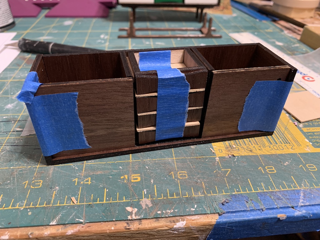 The sides of the drawers are slightly recessed to accommodate the small 1/16” thick wooden drawer guides that will be glued to the cabinet dividers. So, I needed to allow for the width of the drawer guide that extended outside the recessed drawer sides. I cut four of these and with the tiniest amount of glue in the drawer recess, I glued one on each side of two of the drawers. I then stacked the drawers and taped them together.