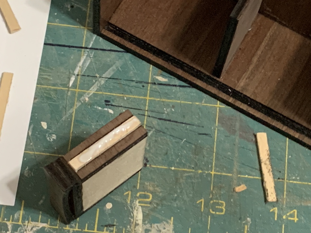 With the excellent finish that I had gotten on my doll house floors by using walnut strips that needed no wood stain (only polyurethane), I told my sister that rather than having to first stain the lighter basswood, I wanted to use a dark wood for my furniture. We found a dark walnut plywood veneer and ordered some. She cut the credenza out for me and then brought it to me when both my sisters drove over for the Fourth of July.