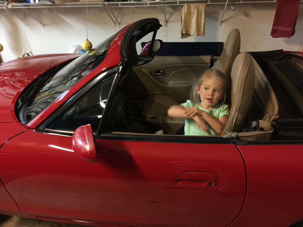 Our in-town granddaughter had a sleepover at our house.  On Sunday morning, it was in the 70s and perfect top-down weather.  Recall that cute little girl that played in the car all those years ago…