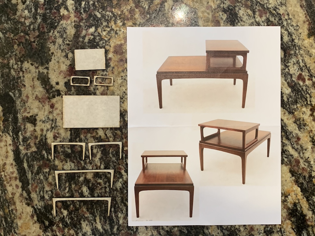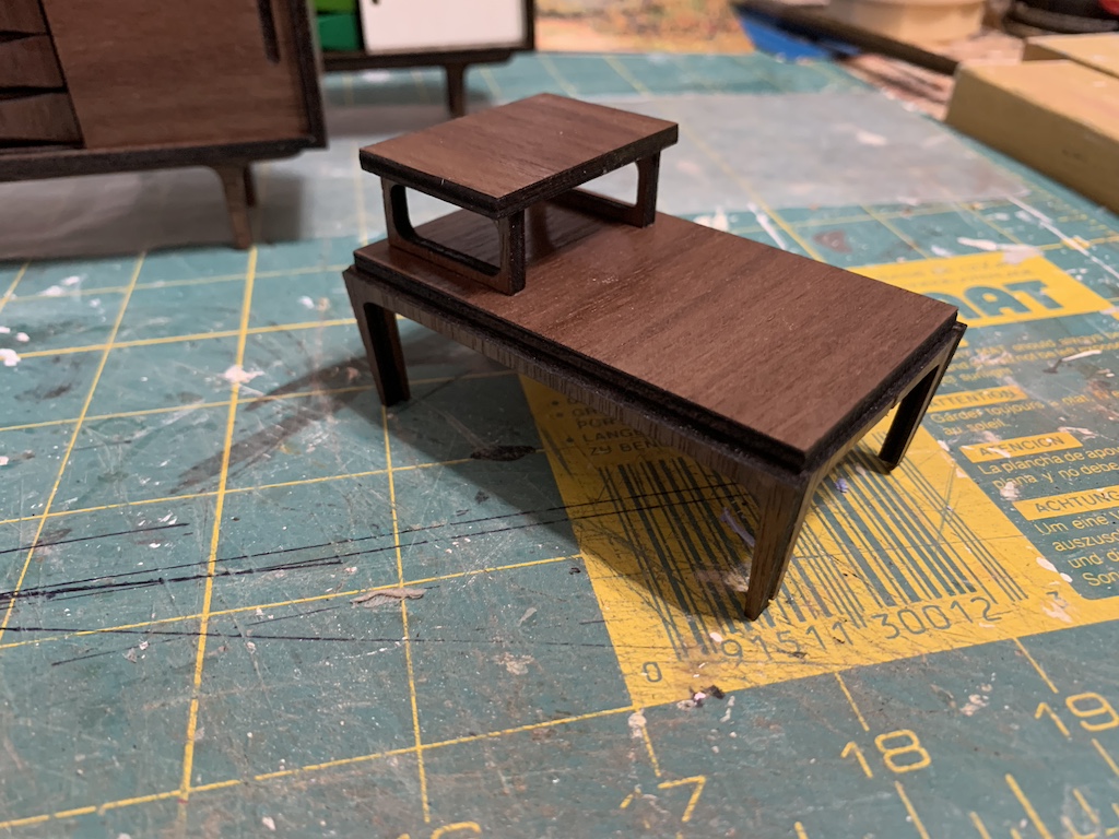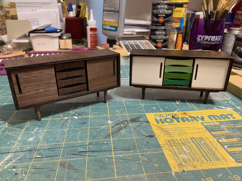 With my sister’s success at creating the credenza, I asked her if I found other full-size pieces of furniture online that I liked, could she make 1/12-scale versions for me? Her reply was yes. So, then I started looking for other mid-century modern furniture I liked.