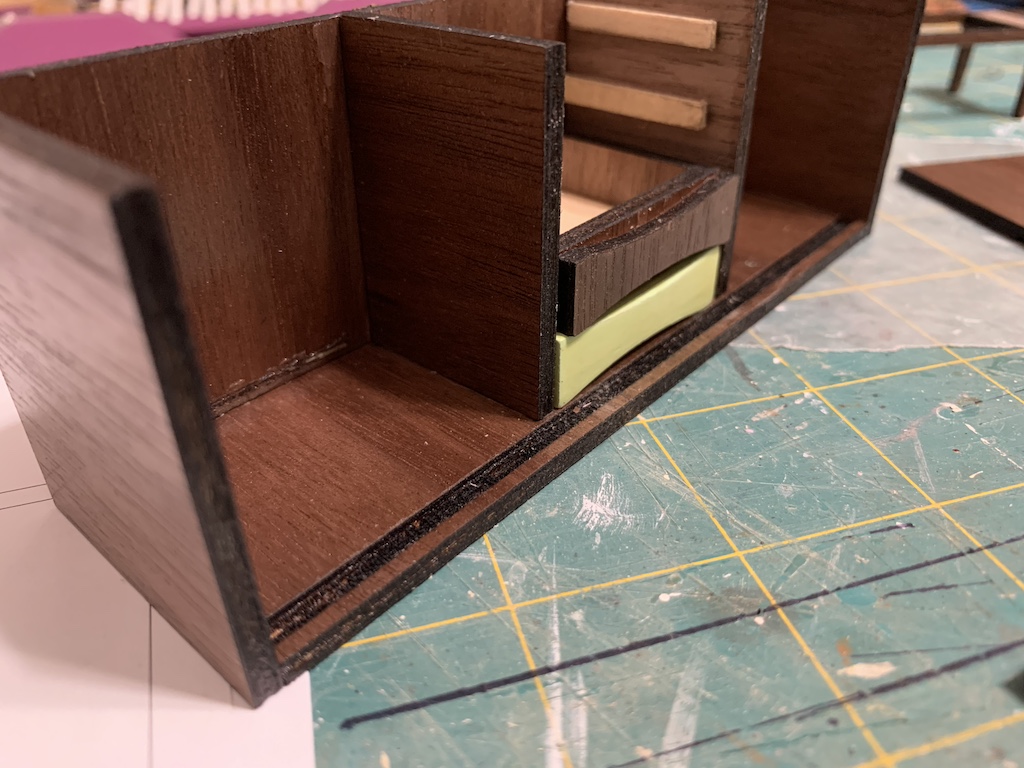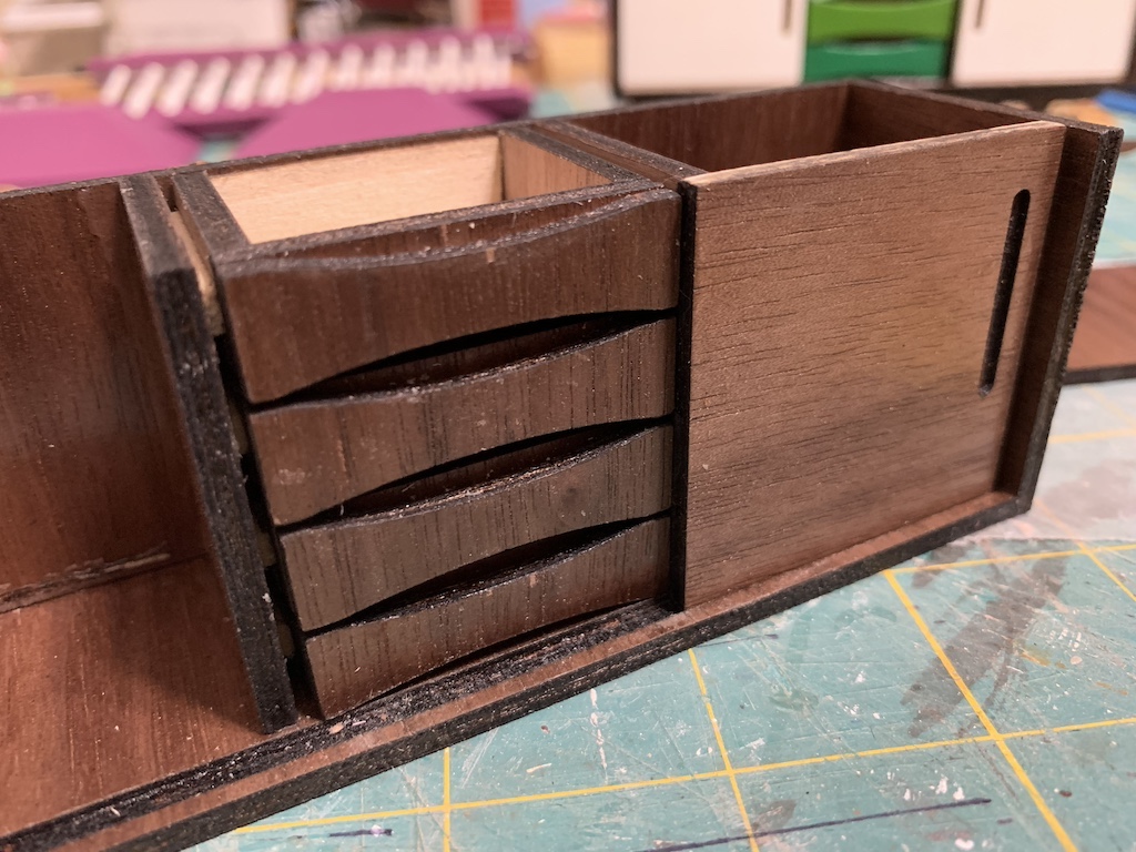 I texted my sister to ask if she had sanded the backs of her drawers, but she said she could not remember. I said no problem, I could sand them but maybe we could tweak the template. She said sure, just tell her by how much. I measured and the drawer was 1/32” too long, not that much but just enough to block the door sliding. When she said she could adjust it, I was just so amazed at how she could do all this computer work to create these fun miniature furniture pieces.