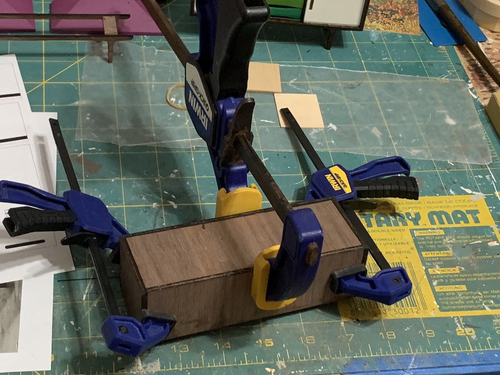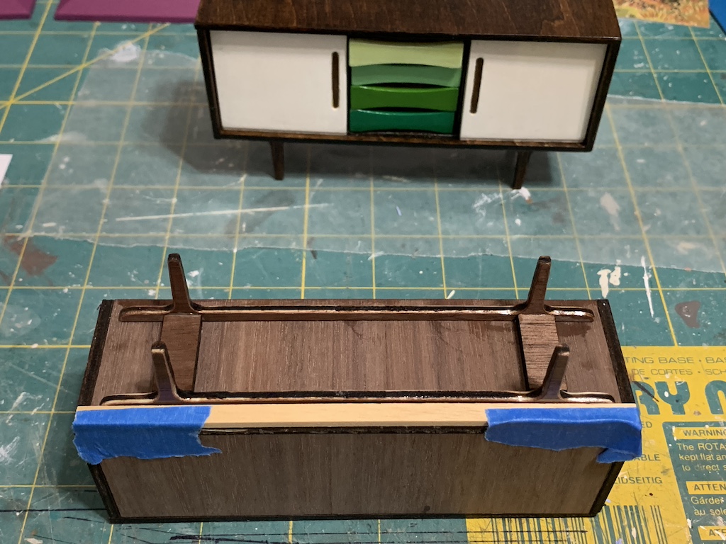 The last step was to glue on the pre-assembled legs. It just so happened that a 3/16’ wide strip of basswood was just what was needed to center the legs evenly front to back. So, I taped a piece to the back side of the cabinet and then glued the legs in place flush up against this piece of basswood.