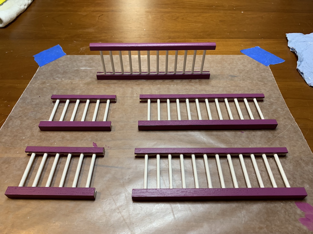 After completing the dozen shutters, I decided to tackle the porch railings. Unlike the last five dollhouses I have built most recently where the balusters and railings were separate pieces, in this kit, the railings were already assembled. This would not be a problem if both were to be painted the same color but just like this same dollhouse I built for my granddaughter, I planned to paint the railings the purple trim color while the balusters would be white.