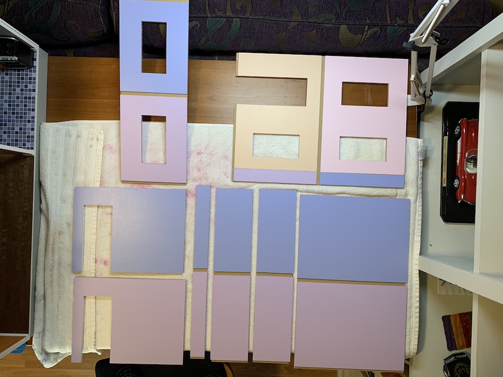 I then proceeded to paint all of the other trim pieces either white or purple as I knew when I returned to assembling the dollhouse, I would appreciate that all of these pieces were already painted which would make construction progress run smoothly without delays.