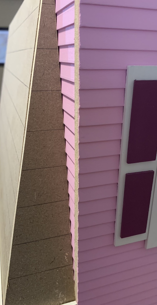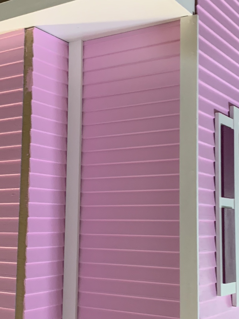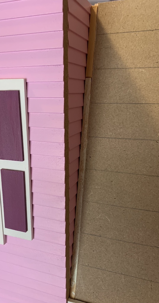 Using some left-over wooden scraps from a previous doll house, I glued in two small strips to close that gap.