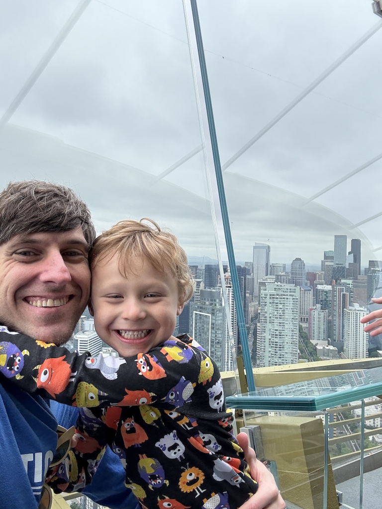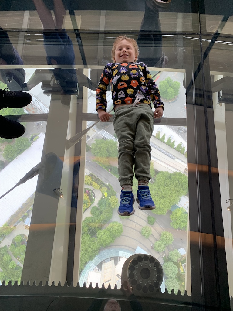 When I visited the Space Needle with my brother in 2021, I could not even force myself to step on the glass floor. But my youngest grandson, only four, had no fear at all. He even pretended he was walking a tight rope at the intersection of two of the panels. Based on his fearlessness, I got up enough courage to at least step on the glass floor this time, although only briefly.