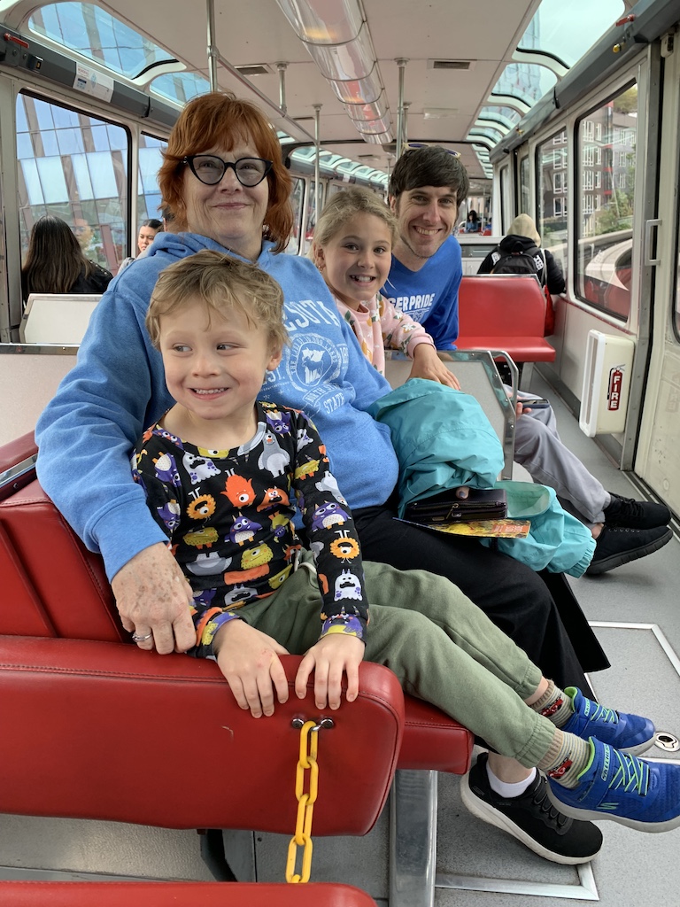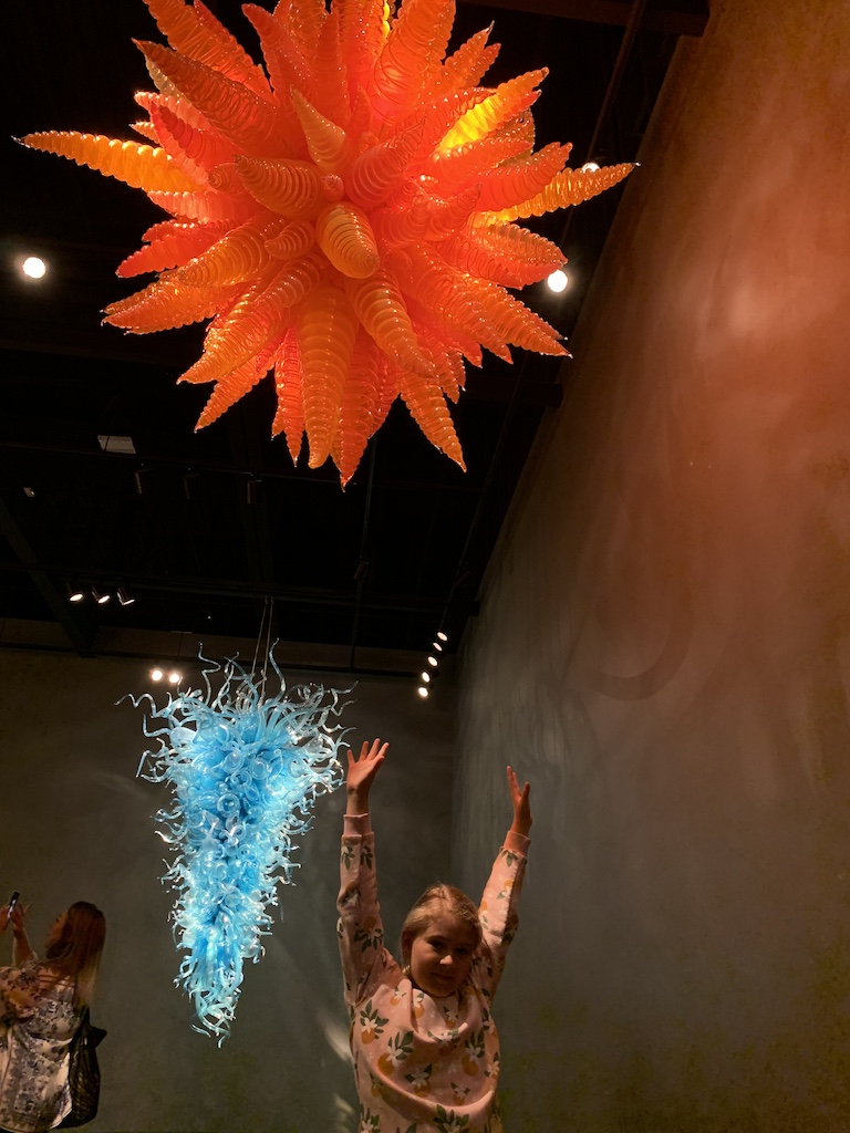 We had purchased tickets in advance to go up in the Space Needle and tour the Chihuly Glass Museum. The Space Needle, the iconic image of Seattle built for the 1962 World’s Fair, is always a must see for anyone’s first visit to Seattle. The Chihuly museum, which is right next to the Space Needle, was also on our list as both grandchildren had admired a book I had of his art.