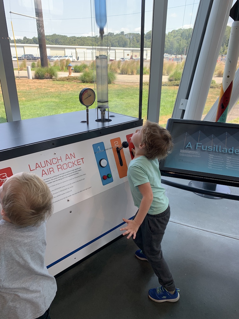 With two 10-year-olds, a seven-year-old, and a four-year-old, there were a variety of interests and so us five adults accompanied different children to different parts of the museum. Our youngest grandson particularly enjoyed launching this rocket bottle skyward after pumping it up to the maximum line on the pressure gauge with air. We later asked him how many times he had done it to which he replied 42.