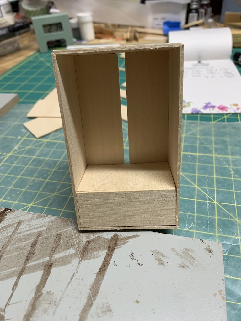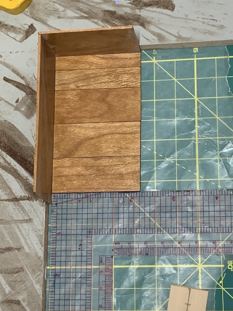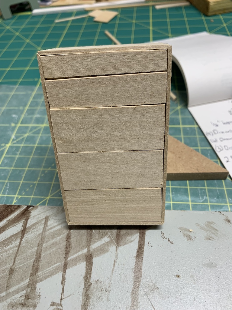 In the photo above, you will notice that my back piece is split in half.  At the time, I did not have a 1/8” piece of basswood wide enough to make the back a single piece.  Instead, I used two 1” strips of 1/8” basswood.  Serendipitously, I discovered with the gap, if a drawer got stuck (like it did while building this prototype), rather than trying to pull it out from the front, it could be pushed out from the back with a small piece of wood.  Just another creative scientific discovery by accident!