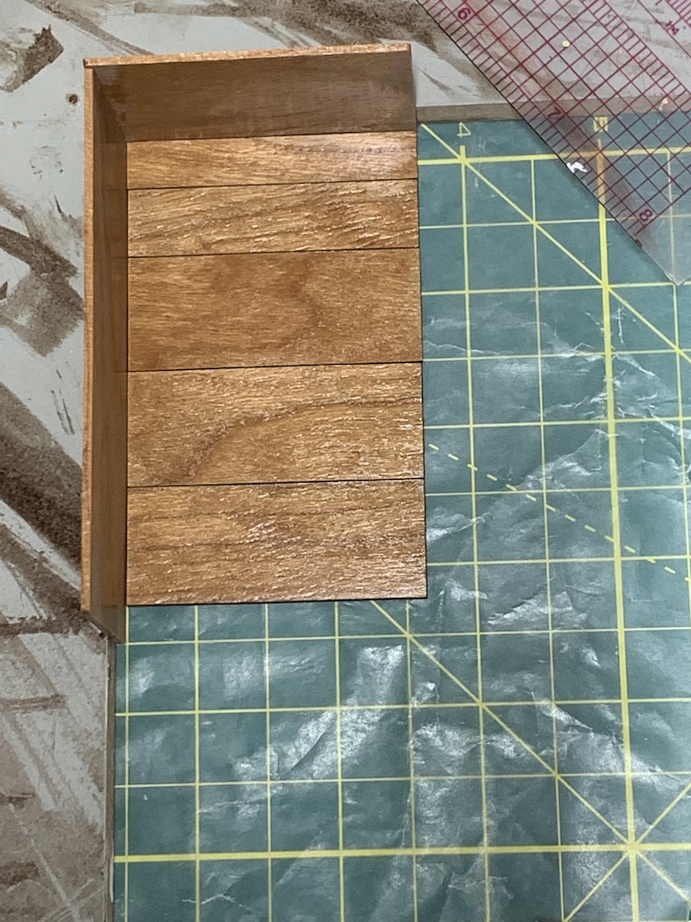 She also showed me her 45° hand sander she had made, and I was most impressed.  She thought it would work great on sanding rigid 1/8” wood but she had concerns trying to sand such thin wood as 1/16” since it flexes so easily.  Prior to cutting out the chest pieces, she made the wise conservative decision to forgo the use of her sander and modified my chest dimensions to use the alternative approach of having the top and bottom overlap the sides.