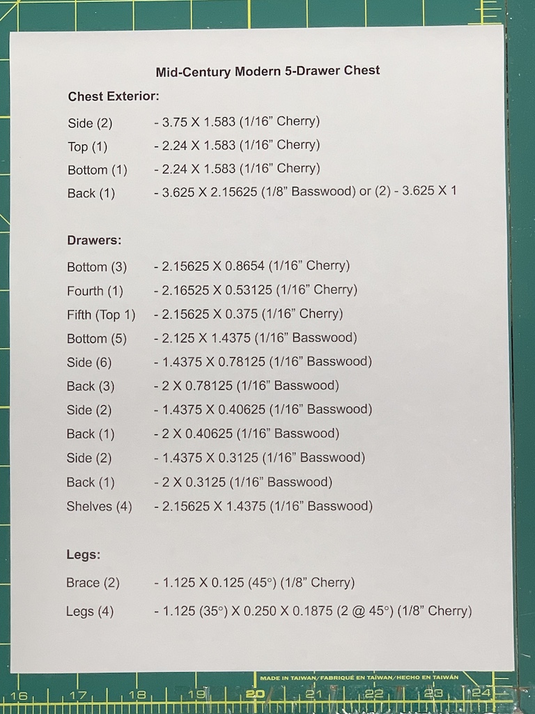 The good news was, I could cut the extra height off the sides and cut the extra length off the drawer fronts and make everything fit.  I would also have to cut some off all the drawer bottoms, drawer backs and hidden drawer shelves but these were made from easy to cut basswood.  I proceeded to make the cuts, capturing the new lengths to update my dimension page for my sister.