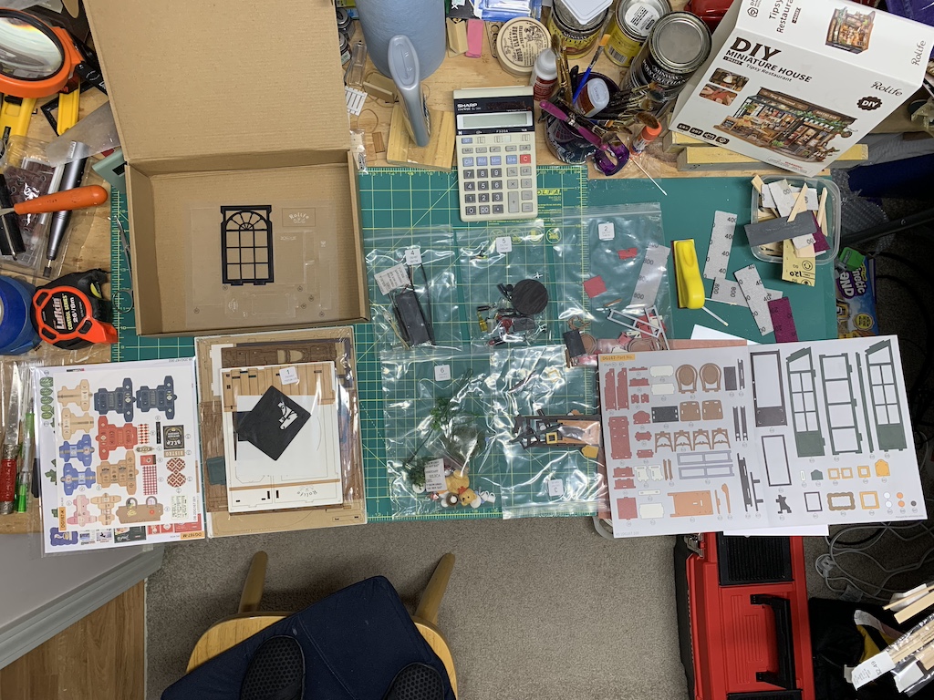 As I removed bags from the box, I was pleased to discover several things. First, unlike the previous kit, there was only a small amount of wire (thankfully). Second, I was very pleased to see that the LED light was already attached to the tiny wires, no doubt in response to numerous complaints about how challenging it was to securely attach the light leads to the thin wires. Third, I saw that many of the patterned flooring was already attached to the wooden structures obviating the need to cut these out and glue them down. Fourth, the paper patterns that were needed were already die-cut making them a breeze to remove. Fifth, it included no paint. And finally, it included no glue but rather small pre-cut double sided tape strips.