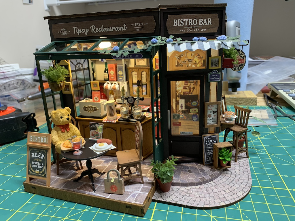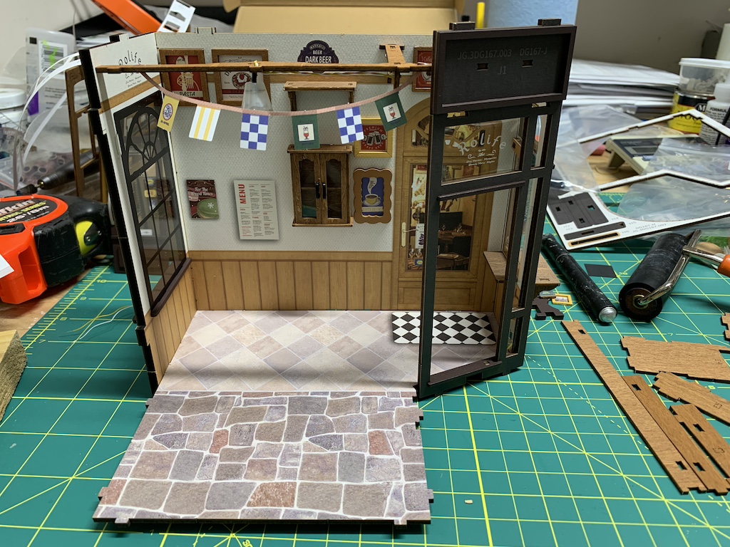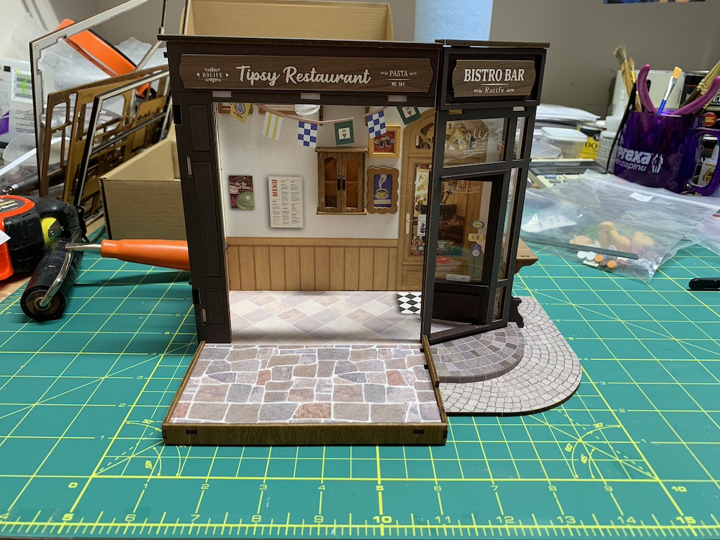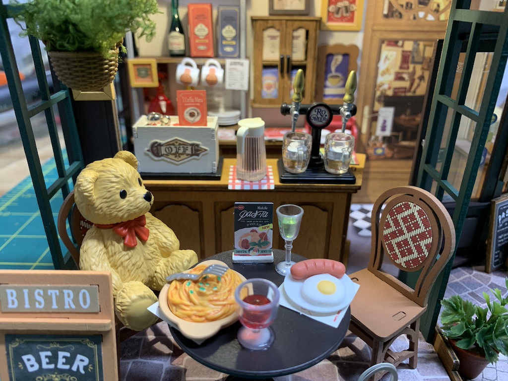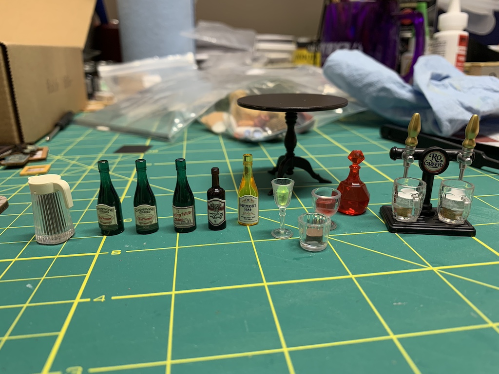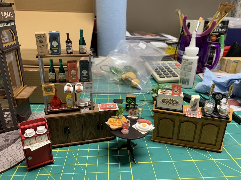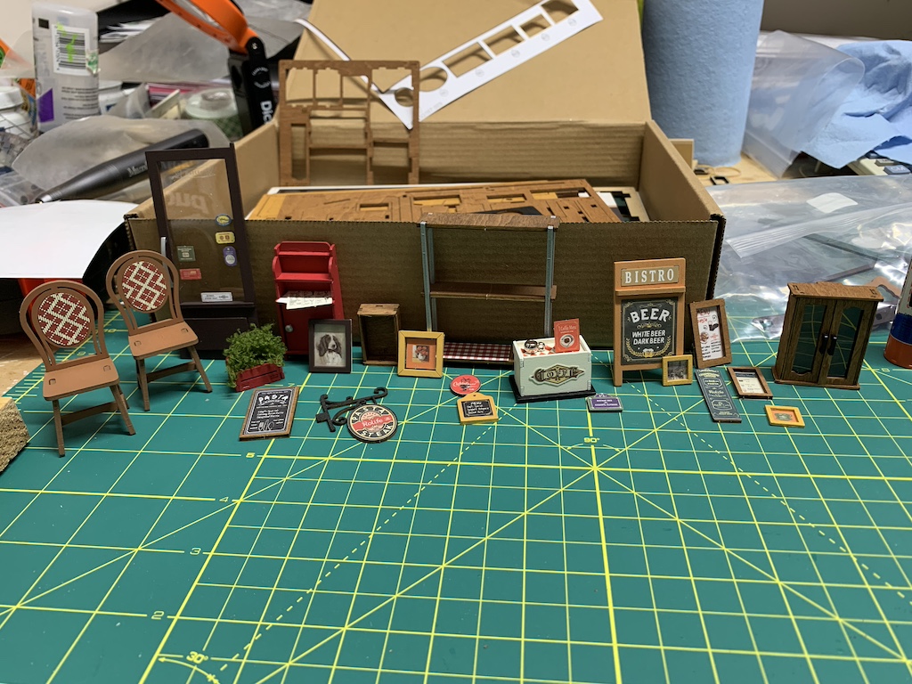 Now I was ready to add all of the previously assembled furnishings as well as building some more restaurant fixtures.