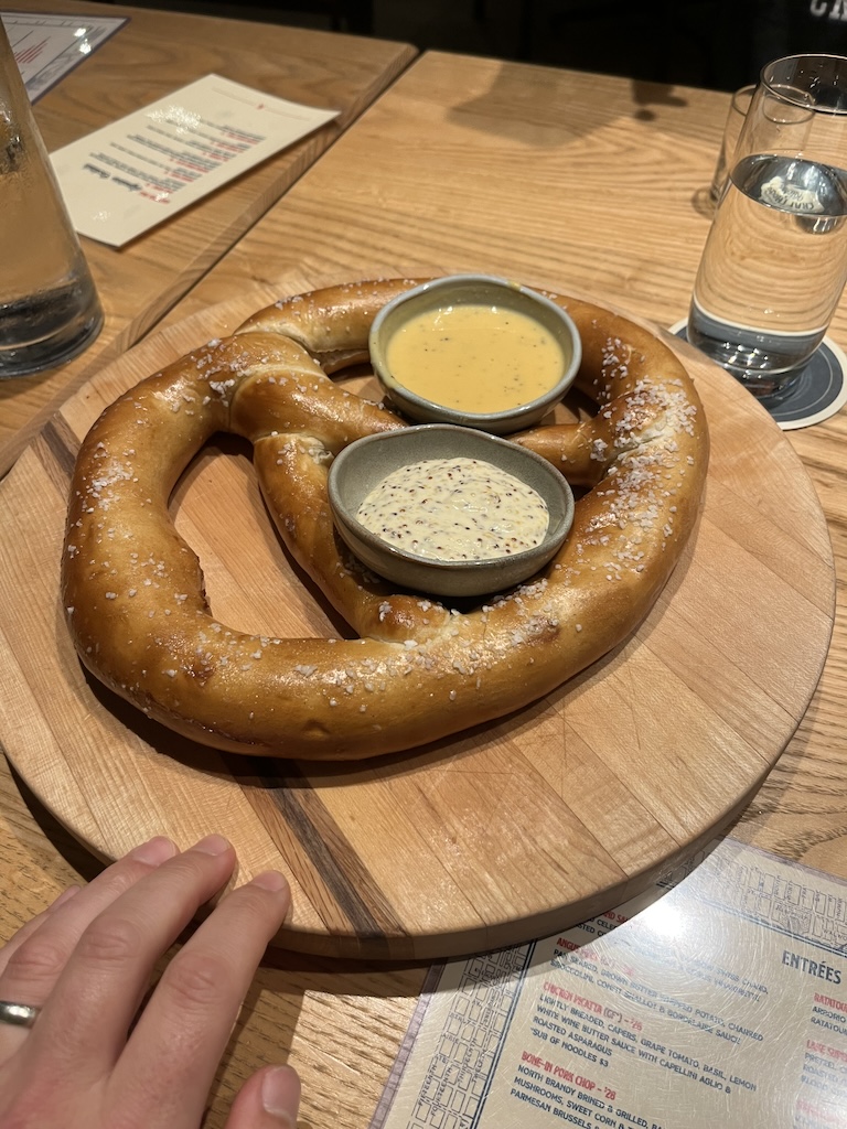 Once we sat down, we started off with some of the food Milwaukee is best known for—fried cheese curds and a big German pretzel.