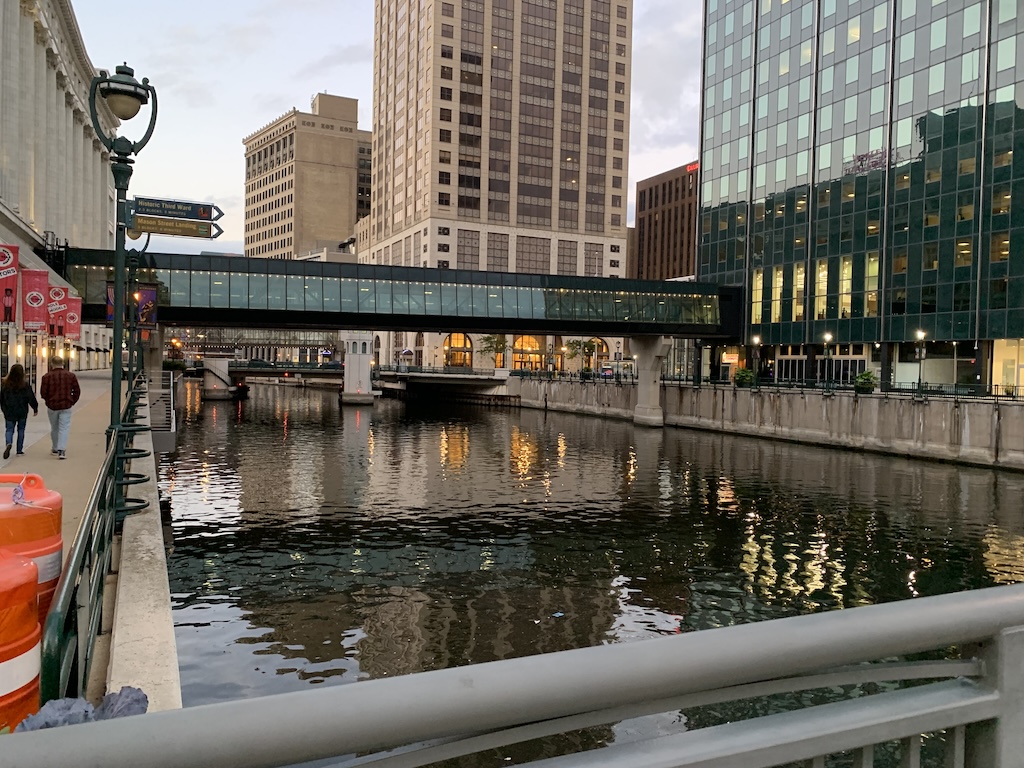 Our hotel backed up to a really nice downtown feature of Milwaukee, the Riverwalk where you can stroll along the river for three miles from one neighborhood to another.  We took advantage of it our first night and walked along it to a craft distillery for dinner.  They had a nice rooftop bar where we could enjoy a—used guessed it—an Old-Fashioned cocktail while we waited for our table.