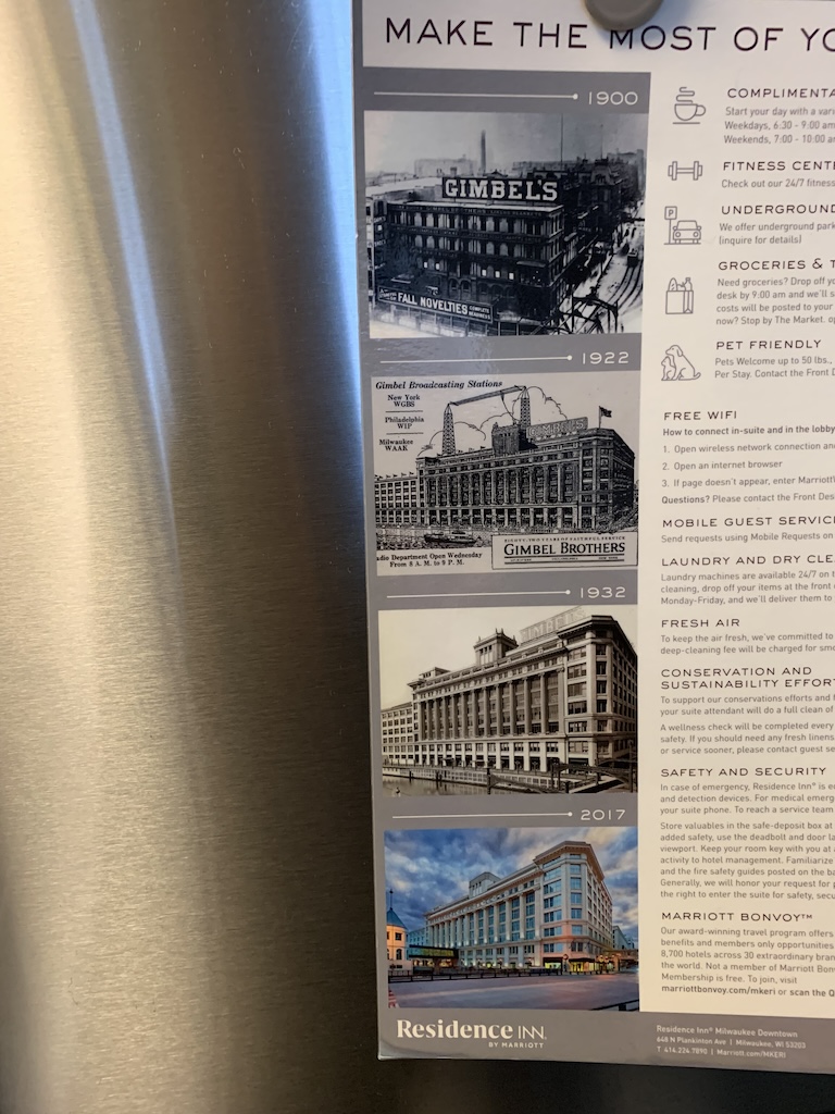 We arrived on a Friday afternoon and checked into our hotel.  At the time that we booked it, none of us knew our hotel was originally a Gimbels department store right next to the Milwaukee River.  So, it was really nice to be staying in modern accommodations in an old historic building.