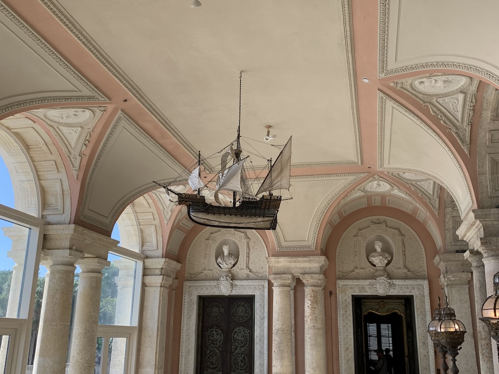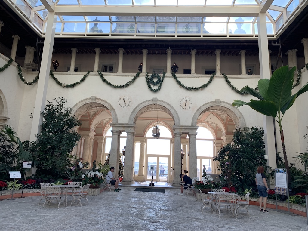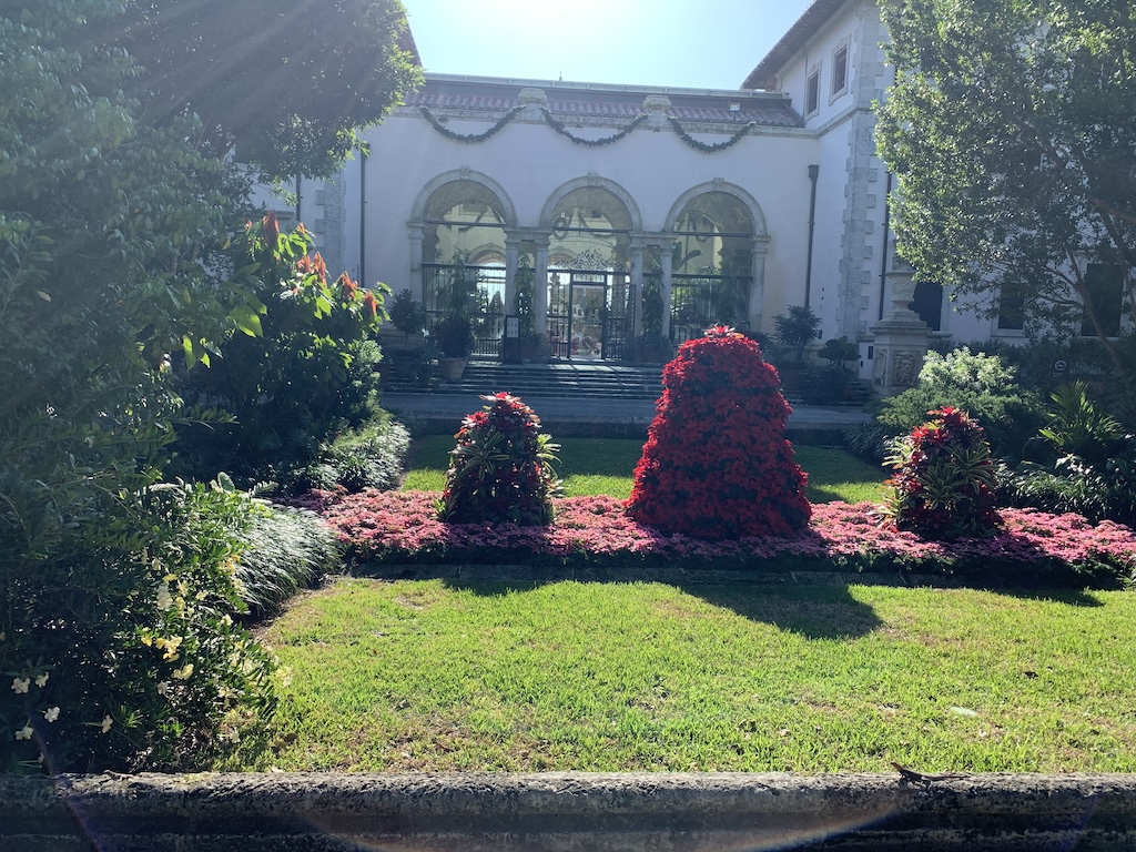 The next morning after enjoying coffee on our balcony, we took an app ride-hailing service to see Vizcaya.  A National Historic Landmark, Vizcaya Museum and Gardens is a 1916 waterfront estate home with 32 decorated rooms and 10 acres of formal gardens.  It was built for James Deering, son of William Deering who, in the 1870s, founded his own agricultural manufacturing company that merged in 1902 with McCormick Harvesting Machine Company to become International Harvester.