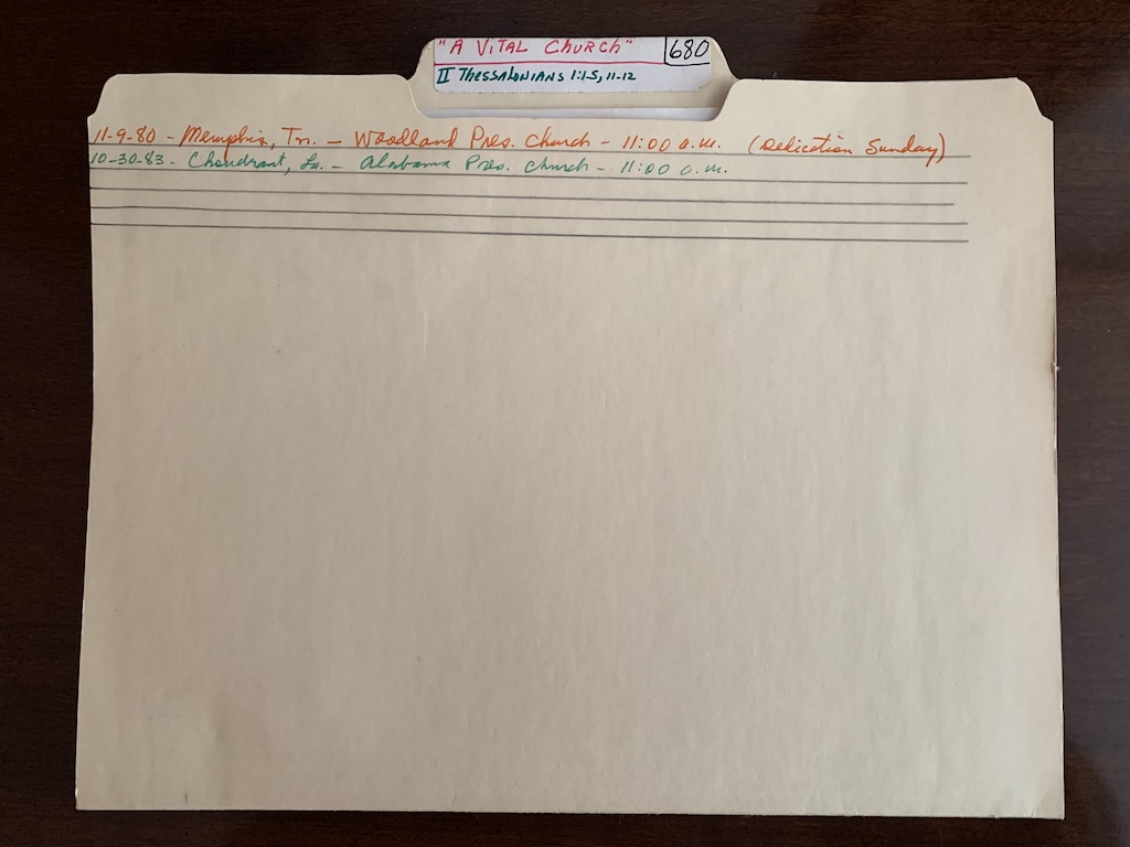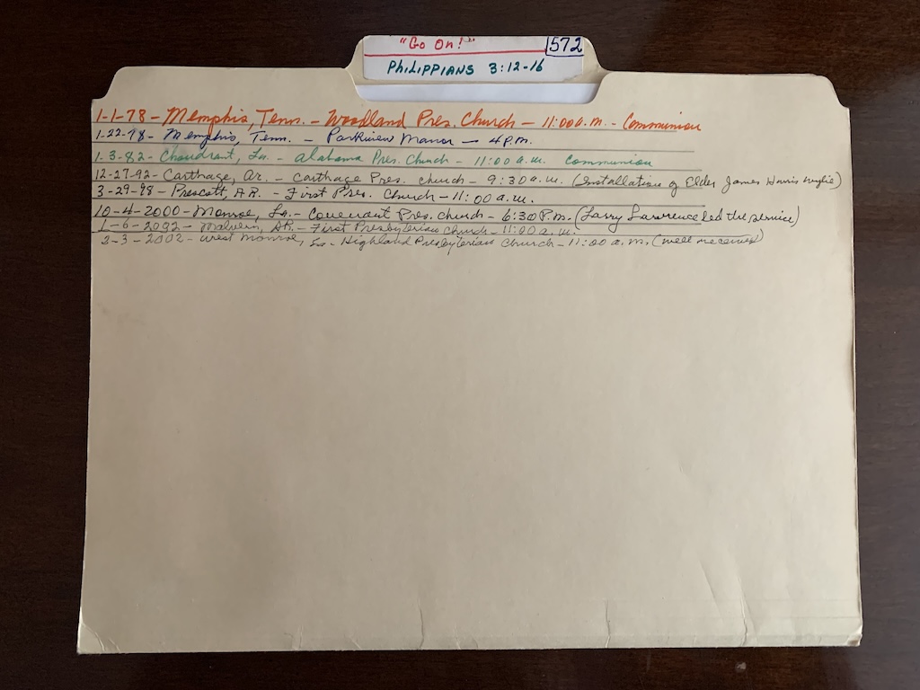 My dad was very organized indeed (one of his traits I am proud to say I have inherited from him)!  Dating back to his first sermon in 1949, each sermon he wrote was safely ensconced inside a numbered manila folder.  On the outside, he wrote the date, location, and time he preached that sermon, always at a different location (he apparently had no reruns, never giving the same sermon to the same congregation).  Over his lifetime, he served as a full-time Presbyterian pastor at seven different churches, thus the reason some of the sermons were given multiple times over his career.