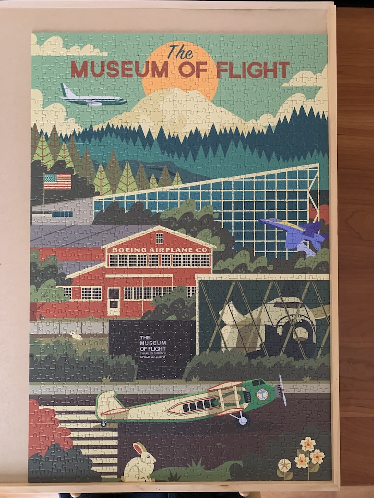 My daughter and her family live in Seattle, WA and our favorite museum to go to when we visit is what we affectionally call the “airplane museum”, but more correctly, the Museum of Flight. Whenever we go, we always make a stop in the gift shop before leaving, and I have often found myself looking at their selection of puzzles. But never in all my years of going have I seen this puzzle, so it was a real thrill when I unwrapped it.