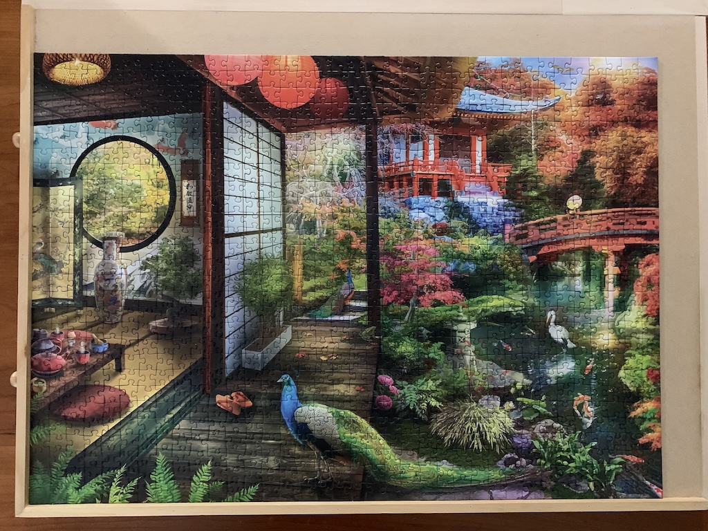 No one knows me and my love for puzzles better than my wife of 46 years, so she has also given me puzzles multiple times in the past. This year she branched out from the ones that she has given me before by selecting one that depicts a calming Japanese scene. Since neither of us have been there, I can only guess that knowing our son and daughter-in-law are traveling to Japan this year to celebrate their 15th wedding anniversary, somehow inspired my wife to pick an oriental theme.