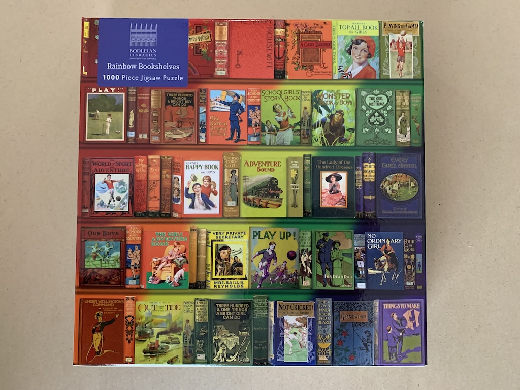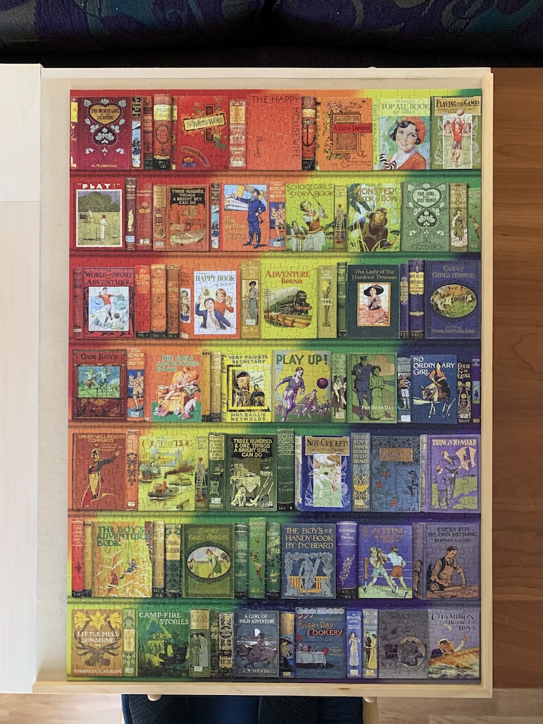 Organized in a colorful rainbow display of book covers and spines, it made for pulling out pieces of one common color at a time easy while ignoring all of the other pieces. Starting with the purple books, I worked my way from the bottom right to the top left of the puzzle. The only slight confusion was there were a couple of book spines that were repeated.