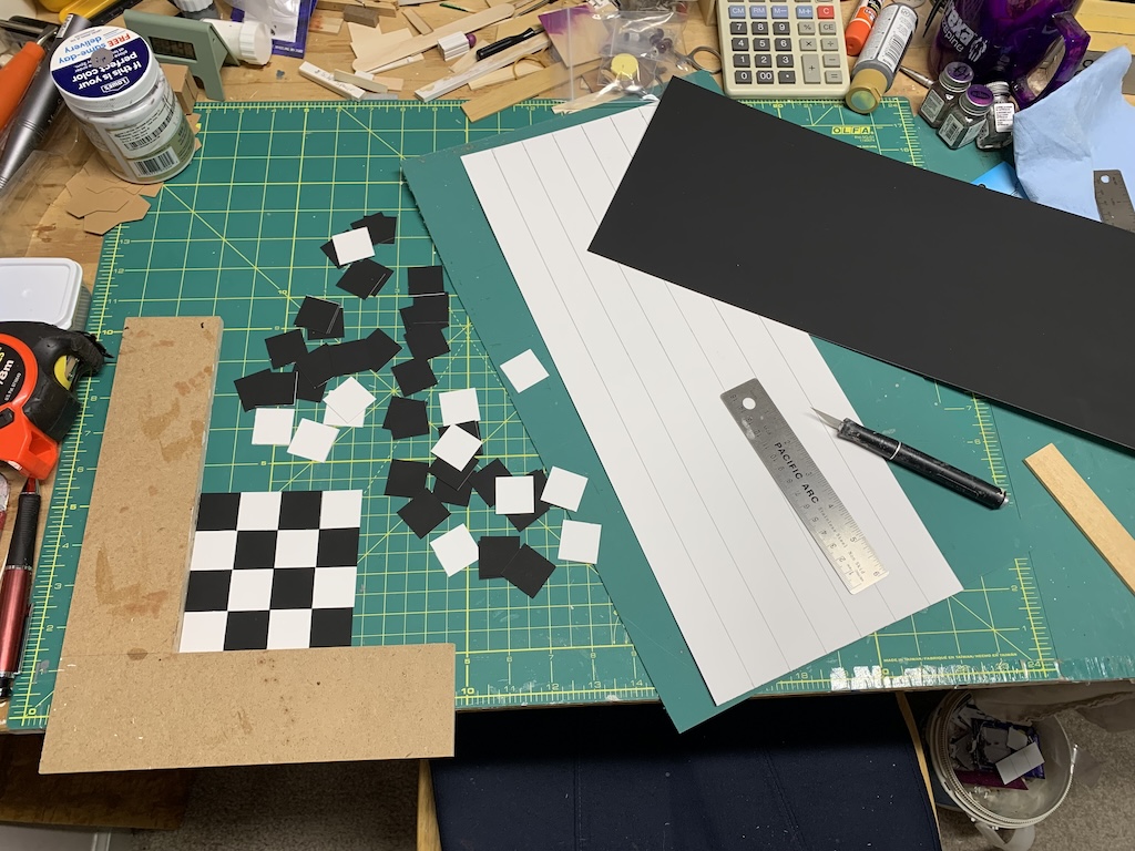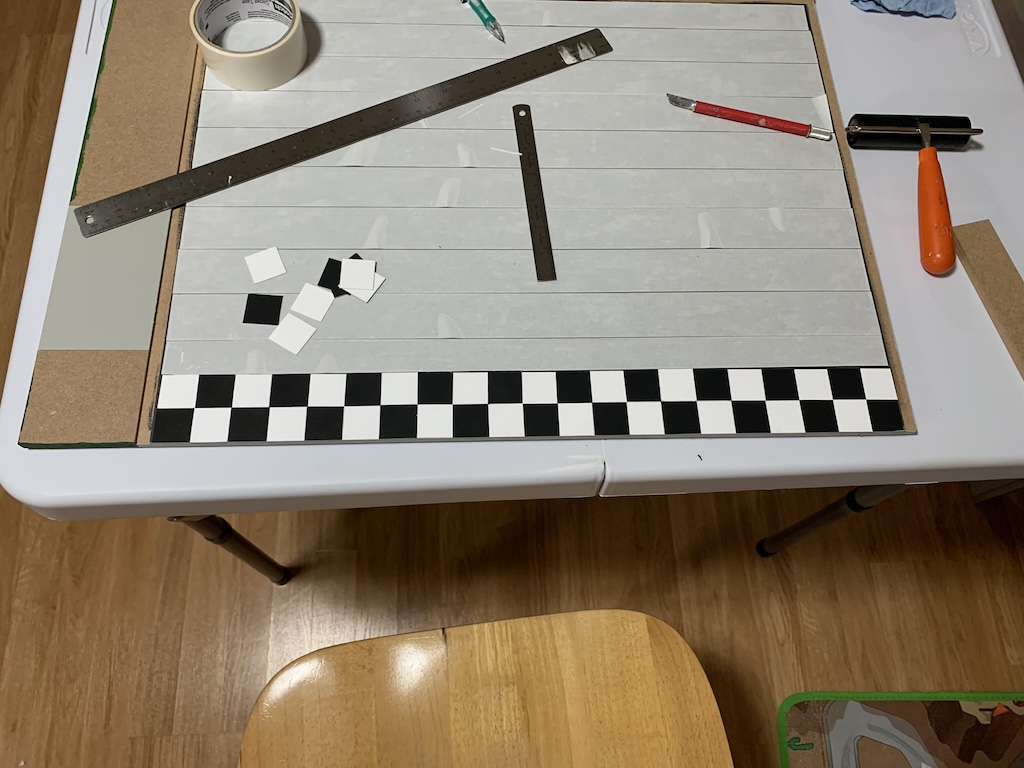 While originally thinking my sister could cut me precisely sized squares with her Cricut cutter, given the trouble she was having with her cutter, I knew I needed to come up with an alternative solution.  I first tried to find contact paper with the checkered pattern of the right size (a common size of these garage floor tiles is 12 inches which in my scale would be 1-inch squares) but everything I found, the squares were either way too big or way too small.  Wandering the aisles of a hobby store I frequent, I came across a flat black poster board.  Since the back of it was white, I would not have to buy a separate white one as well.