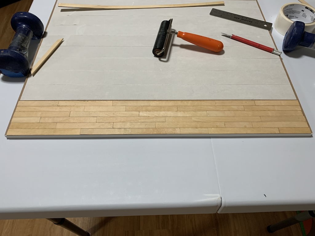 With the carpet tape down on the loft floor, I was ready to cut the 1/2-inch-wide birch strips into varying lengths of planks.   But how long should they be?  Looking back at the mahogany flooring I had installed in my Craftsman style doll house, I found that I had cut these strips into 2-, 3-, 4-, and 5-inch planks to give me a number of combinations to complete a row and avoid plank end joints lining up directly side-by-side.