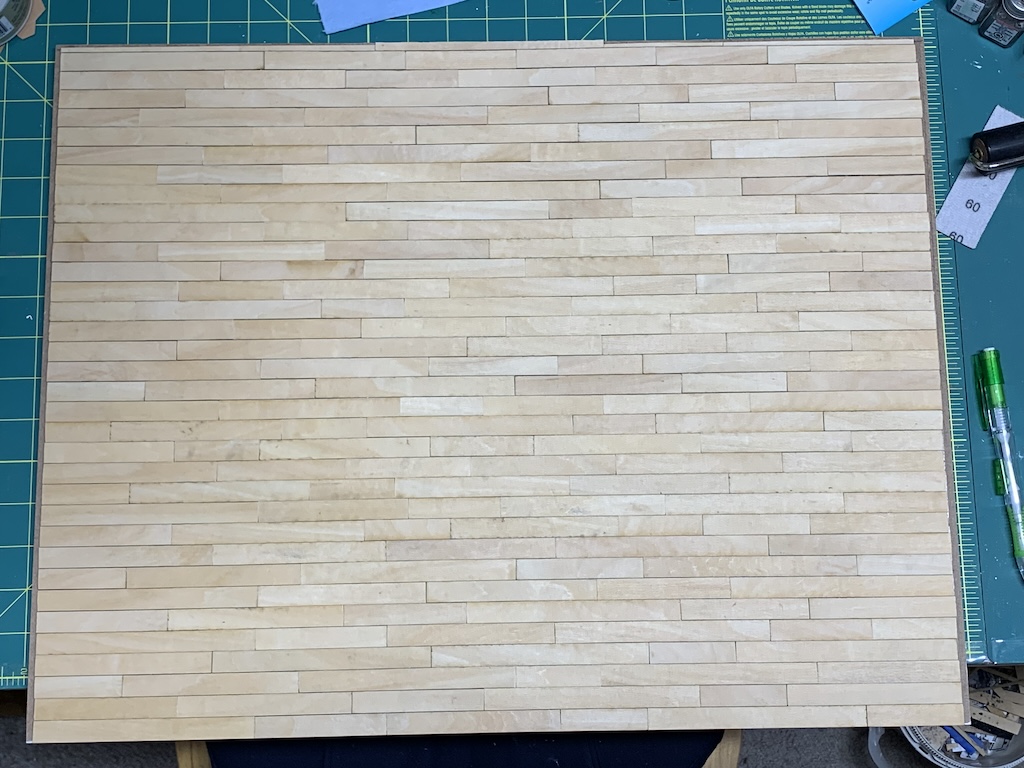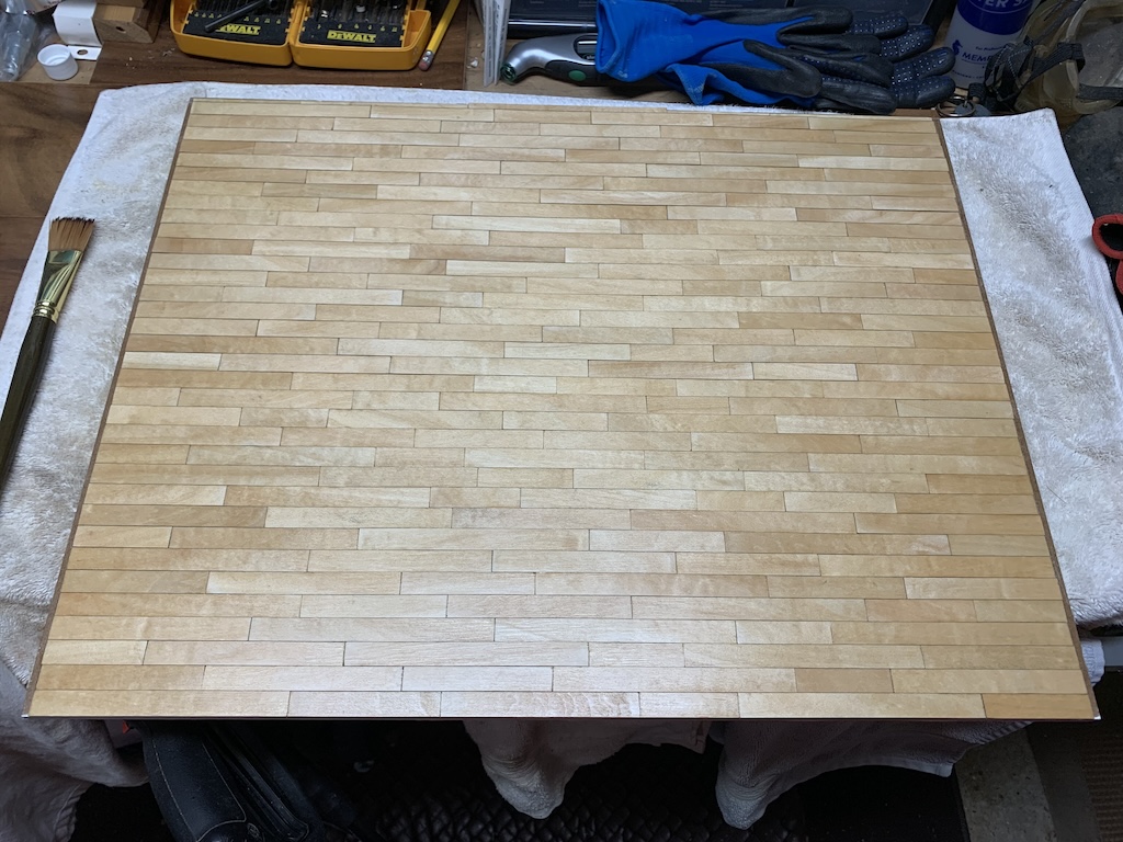 After it dried, I was very pleased with this final smooth finish.  While I still had some visible gaps, overall, I thought the floor looked great.  If anyone ever noticed the gaps, I would just go with that rainstorm story to explain some of the gaps between rows.  And besides, the gaps gave the floor a more “lived-in” look.